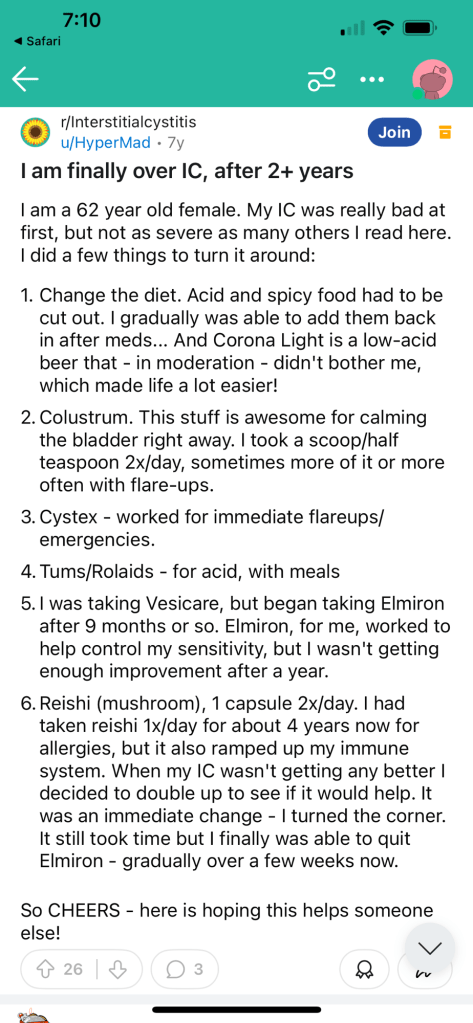I found this post on Reddit. The title “I am finally over IC, after 2+ years” caught my attention. Who knows if this person is still Interstitial Cystitis symptom-free, but I thought this was worth sharing. I reached out to the person who posted this to see if she is still doing well. I will update this post on my blog if she responds.